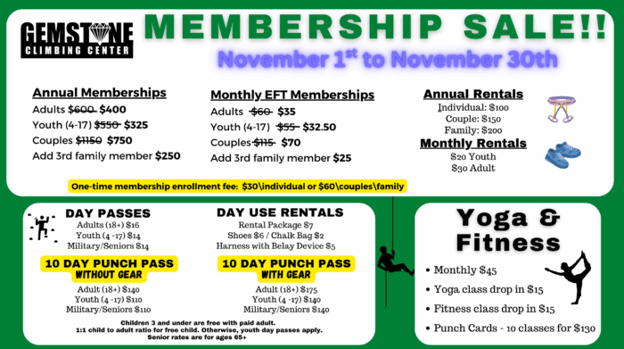For any questions contact Kim or Patty at 208-329-7257 or kim@gemstoneclimbing.rocks or patty@gemstoneclimbing.rocks.